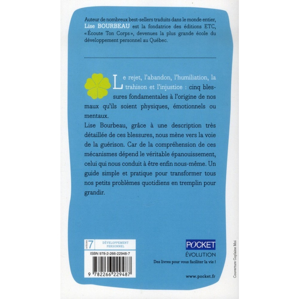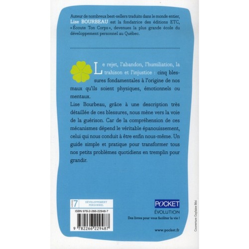 Lise BOURBEAU, auteur de nombreux best-sellers traduits dans le monde entier, est la fondatrice des éditions E.T.C. – Ecoute Ton Corps –, devenues la plus grande école du développement personnel au Québec. Le rejet, l'abandon, l'humiliation, la trahison et l'injustice : cinq blessures fondamentales à l'origine de nos maux qu'ils soient physiques, émotionnels ou mentaux. Lise Bourbeau, grâce à une description très détaillée de ces blessures, nous mène vers la voie de la guérison.