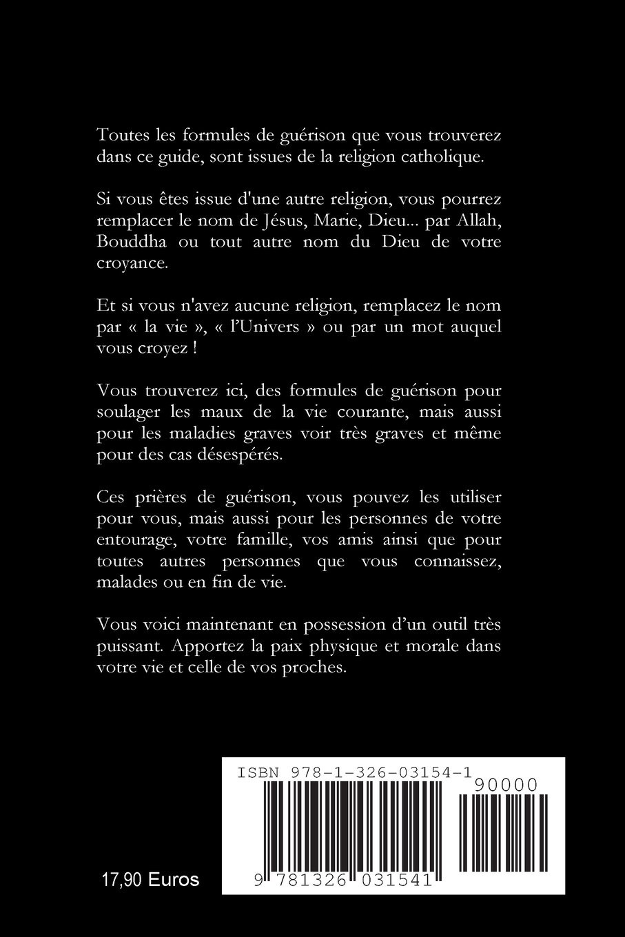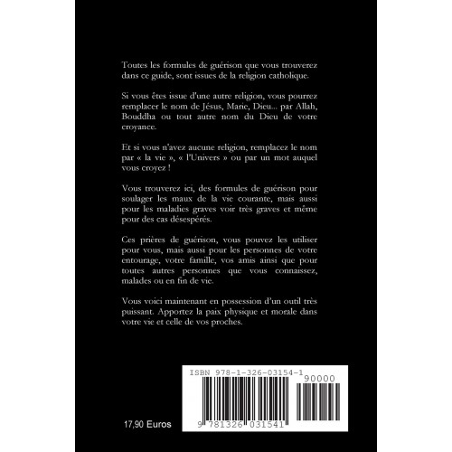 Un guide pratique écrit simplement, facile à lire et à comprendre, réservé à tous ceux qui veulent apprendre, comprendre et pratiquer les prières magiques de guérison des leveurs de maux, guérisseurs et coupeurs de feu, sur eux-mêmes ou sur leur entourage. Vous y trouverez tous les conseils pour obtenir une réussite maximale lors de la mise en application de ces prières. Ce guide est accompagné de 171 prières magiques de guérison, des maux les plus courants de la vie quotidienne (abcès, allergies, aphtes, arthrose, brûlures, coups, contusions, coupures, dépression, diarrhées, entorses, piqûres, migraine, mal de dents, verrues etc...) en passant par les maladies graves, voir incurables. Un guide essentiel pour découvrir cet univers si particulier.