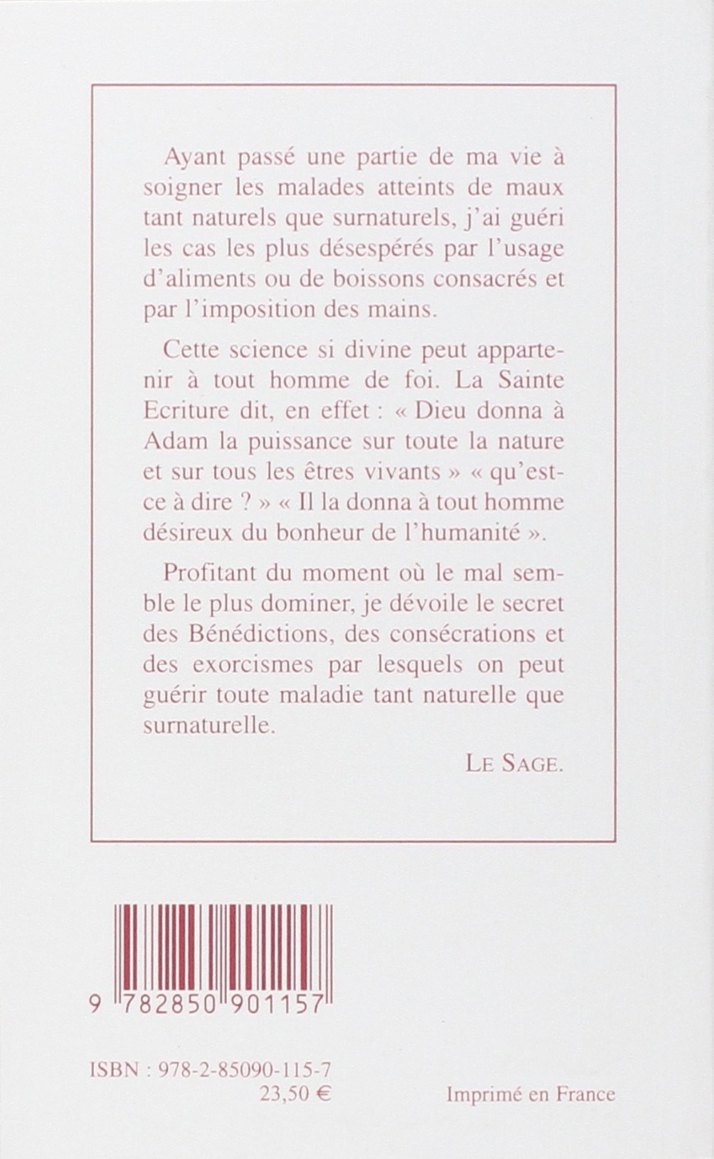 Ayant passé une partie de ma vie à soigner les malades atteints de maux tant naturels que surnaturels, j'ai guéri les cas les plus désespérés par l'usage d'aliments ou de boissons consacré et par l'imposition des mains. Cette science si divine peut appartenir à tout homme de foi. La Sainte Ecriture dit, en effet : " Dieu donna à Adam la puissance sur toute la nature et sur tous les êtres vivants " " Qu'est-ce à dire ? " " Il la donna à tout homme désireux du bonheur de l'humanité ". Profitant du moment où le mal semble le plus dominer, je dévoile le secret des bénédictions, des consécrations et des exorcismes par lesquels on peut guérir toute maladie tant naturelle que surnaturelle.